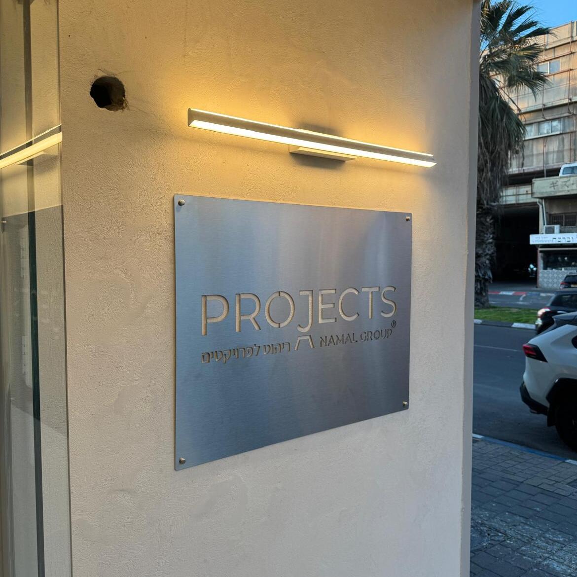 שילוט מתכת עם הרחקה מהקיר באמצעות מרווחים מוסתרים, ליצירת אפקט "צף".
