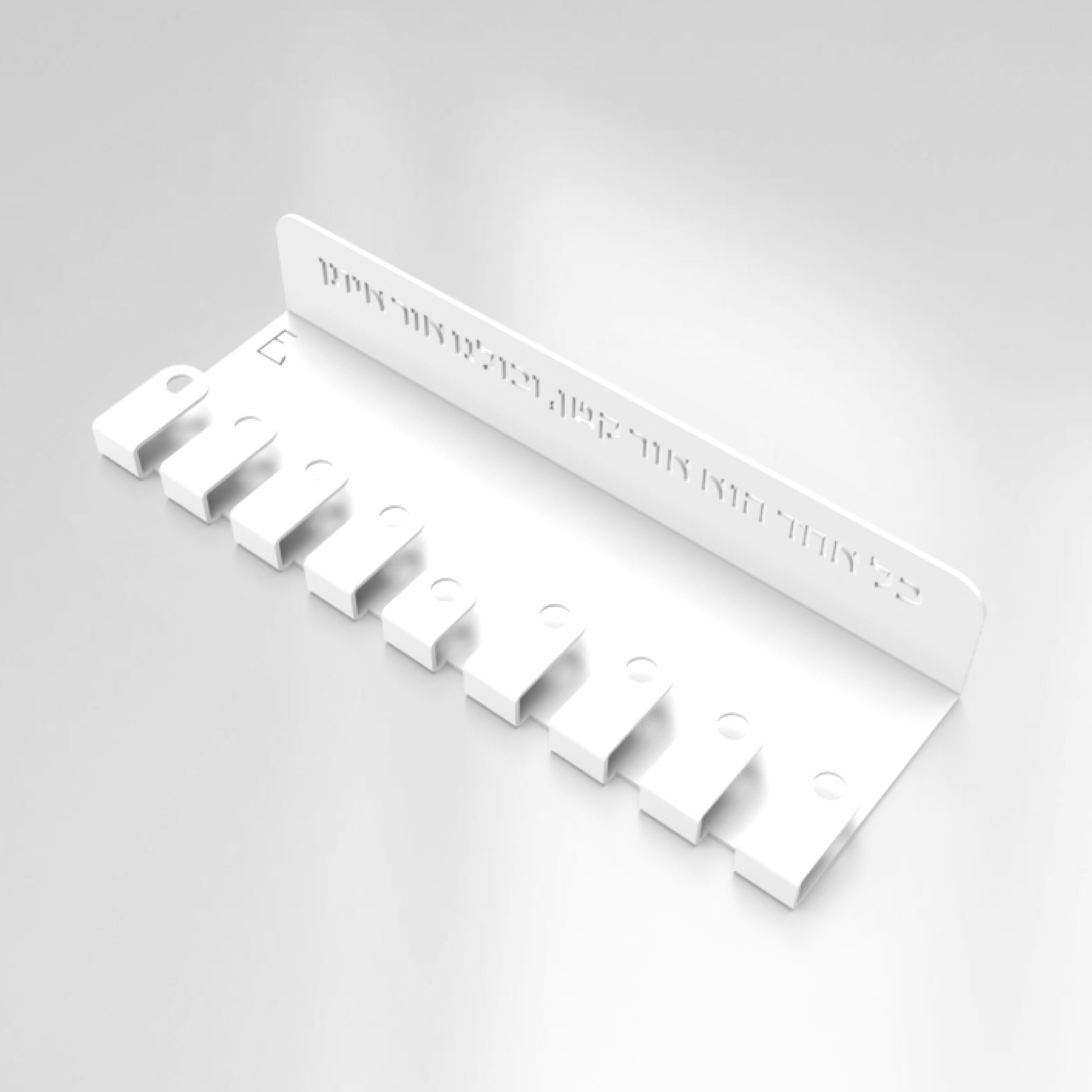 חנוכיית מתכת בחיתוך לייזר מדויק, בעיצוב נקי ואלגנטי. במרכזה מופיע הכיתוב המרגש "כל אחד הוא אור קטן וכולנו אור איתן", המזכיר את רוח האחדות והאור של חג החנוכה.